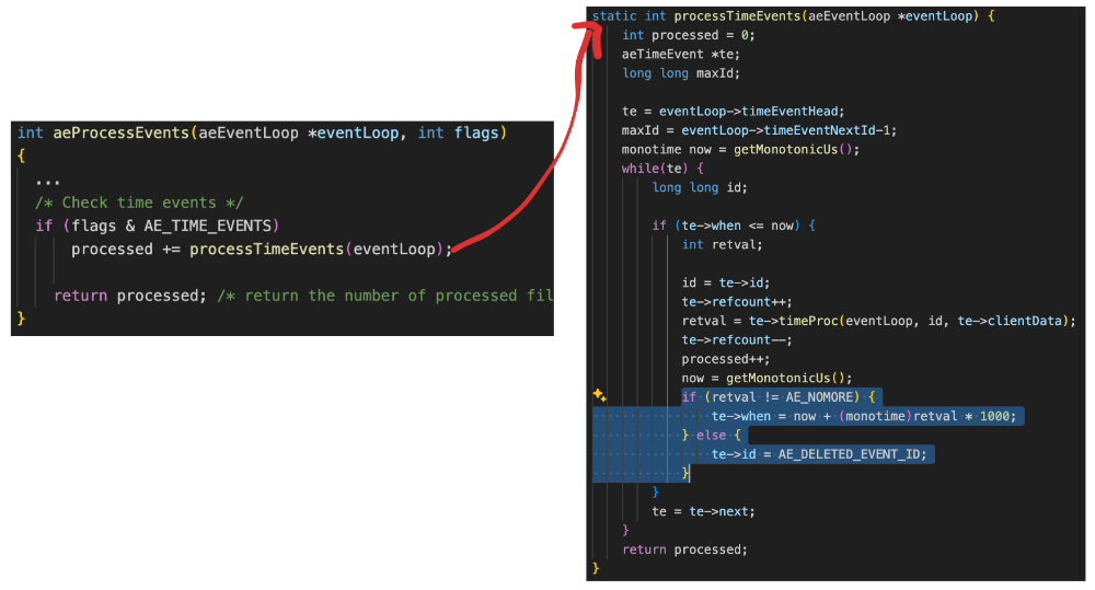 if (aeCreateTimeEvent(server.el, 1, serverCron, NULL, NULL) == AE_ERR) { serverPanic("Can't create event loop timers."); exit(1); } // eventLoop에 Time Event head세팅! 실행하는 함수는 serverCron long long aeCreateTimeEvent(aeEventLoop *eventLoop, long long milliseconds, aeTimeProc *proc, void *clientData, aeEventFinalizerProc *finalizerProc) { long long id = eventLoop->timeEventNextId++; aeTimeEvent *te; te = zmalloc(sizeof(*te)); if (te == NULL) return AE_ERR; te->id = id; te->when = getMonotonicUs() + milliseconds * 1000; te->timeProc = proc; te->finalizerProc = finalizerProc; te->clientData = clientData; te->prev = NULL; te->next = eventLoop->timeEventHead; te->refcount = 0; if (te->next) te->next->prev = te; eventLoop->timeEventHead = te; return id; }aeProcessEvents 마지막 즈음에 Time Event 실행하는 함수가 있다.