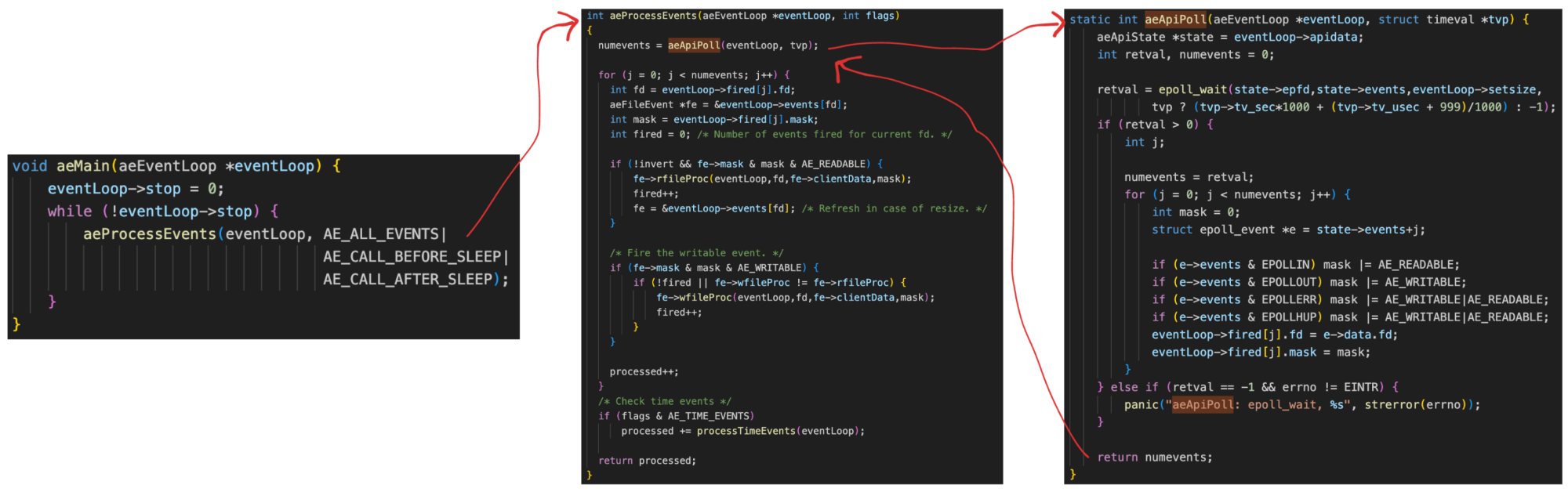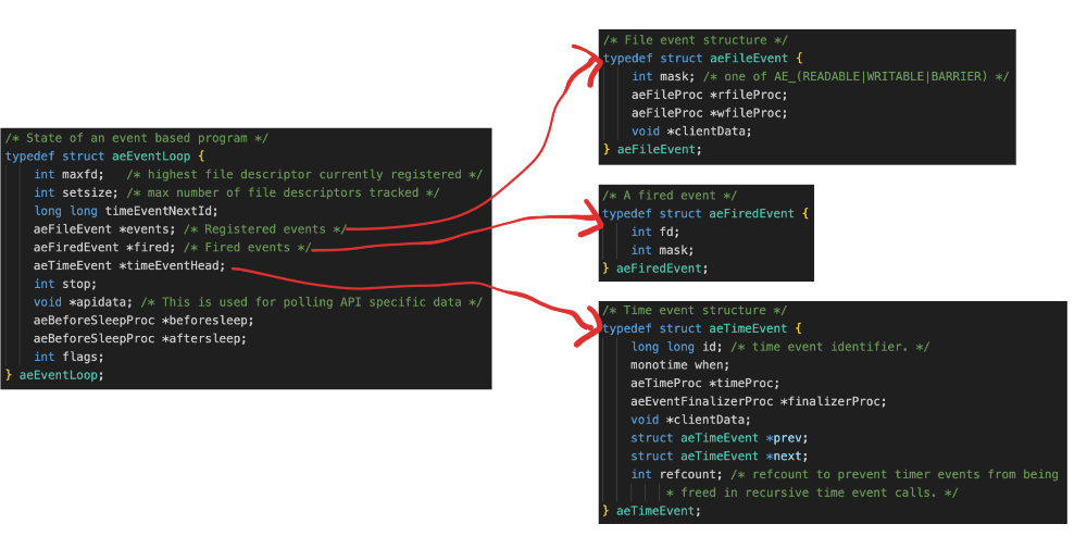 Listner 초기화할 때는 server listner에 accept 했을 때 실행할 AcceptHandler를 등록한다.int main(int argc, char **argv) { ... initServer(); ... initListeners(); ... aeMain(server.el); } void initServer(void) { ... // event loop fd 생성 server.el = aeCreateEventLoop(server.maxclients+CONFIG_FDSET_INCR); ... // 앞에서 만들어진 event loop fd에 timer event 추가 if (aeCreateTimeEvent(server.el, 1, serverCron, NULL, NULL) == AE_ERR) { serverPanic("Can't create event loop timers."); exit(1); } ... } void initListeners(void) { /* Setup listeners from server config for TCP/TLS/Unix */ int conn_index; connListener *listener; if (server.port != 0) { conn_index = connectionIndexByType(CONN_TYPE_SOCKET); if (conn_index < 0) serverPanic("Failed finding connection listener of %s", CONN_TYPE_SOCKET); listener = &server.listeners[conn_index]; ... listener->port = server.port; } ... /* create all the configured listener, and add handler to start to accept */ int listen_fds = 0; for (int j = 0; j < CONN_TYPE_MAX; j++) { ... if (createSocketAcceptHandler(listener, connAcceptHandler(listener->ct)) != C_OK) serverPanic("Unrecoverable error creating %s listener accept handler.", listener->ct->get_type(NULL)); listen_fds += listener->count; } }우선 initServer 함수에서 생성되는 이벤트만 알아보자. (File Event, Fired Event, Time Event)