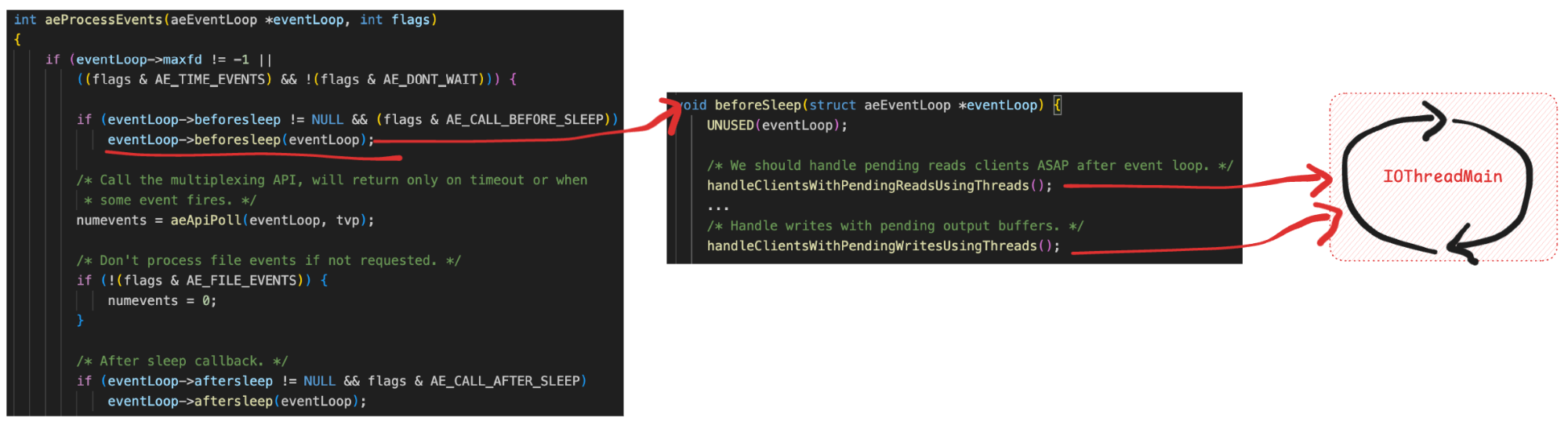 // Valkey 7.2 static void dbSetValue(...) { if (server.lazyfree_lazy_server_del) { freeObjAsync(key,old,db->id); } else { /* This is just decrRefCount(old); */ db->dict->type->valDestructor(db->dict, old); } } // Valkey 8.1 static void dbSetValue(...) { /* For efficiency, let the I/O thread that allocated an object also deallocate it. */ if (tryOffloadFreeObjToIOThreads(old) == C_OK) { /* OK */ } else if (server.lazyfree_lazy_server_del) { freeObjAsync(key, old, db->id); } else { decrRefCount(old); } *valref = new; }5. beforeSleep 할 때 이벤트 목록을 가져오는 aePollApi 호출